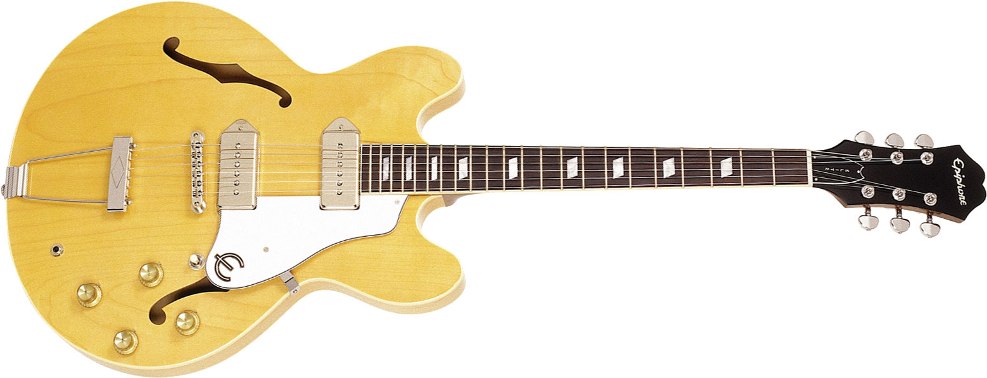 Aug 2012, One More Thing....while returning the Rickenbacker (it always takes 30 minutes to do a return at Guitar Center) I leisurely tried out about 30 guitars - Fender Jags, Jazzmasters, and Pawnshops, Gibson 339's, 335's, LP Studios, and others, and none of them grabbed me...until...until...how have I gone 36 years playing electric guitar without ever trying a P90 single coil equipped hollowbody? There was a used MIC Epiphone Natural Casino - and it was instant music. Everything played and sounded nice. Took it home and loved it. But there ensued a deep Googling of all things Epiphone Casino, wherein I learned the rich history of the Gib-330 inspired beast, the Beatles connection - all 3 not just Lennon used them extensively - and tried to suss the confusing current MIC, MIK, MIJ. and MIA model variations, finally finding a spec comparison chart of all the models. Which led to buying a used MIJ Casino Elitist 1965 Natural from the Scottsdale AZ GC store, which came last night, and at least for the next week it is the greatest guitar I've ever owned and played, wow. It has better woods, US P90s, and better electronics than the MIC, so that one's going back. The cleans are really great, the treble is amazingly articulate, and the distorted voicings are spectacular, what with the hollow body woomph. White Album to Wilco, it's all there. (For $1100 used, I'm stopping here...the MIA Lennon for $4K is pretty much the same but has the skinny neck, no thank you.) It looks like this, (but without the pickguard, Lennon style):