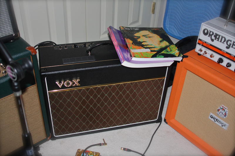 Dec 2010 In love again - my first Vox amp. So chiming and singing, the Mesa Ace has been mothballed, traded in the Egnater. The AC15CC version, Korean-made, all tube, not handwired, circuit board, but with a Celestion Greenback. Its soooo good. Retubed with Mullards and JJs. Been woodshedding for 3 months, very little recording, just pure pleasure, mated with a new....